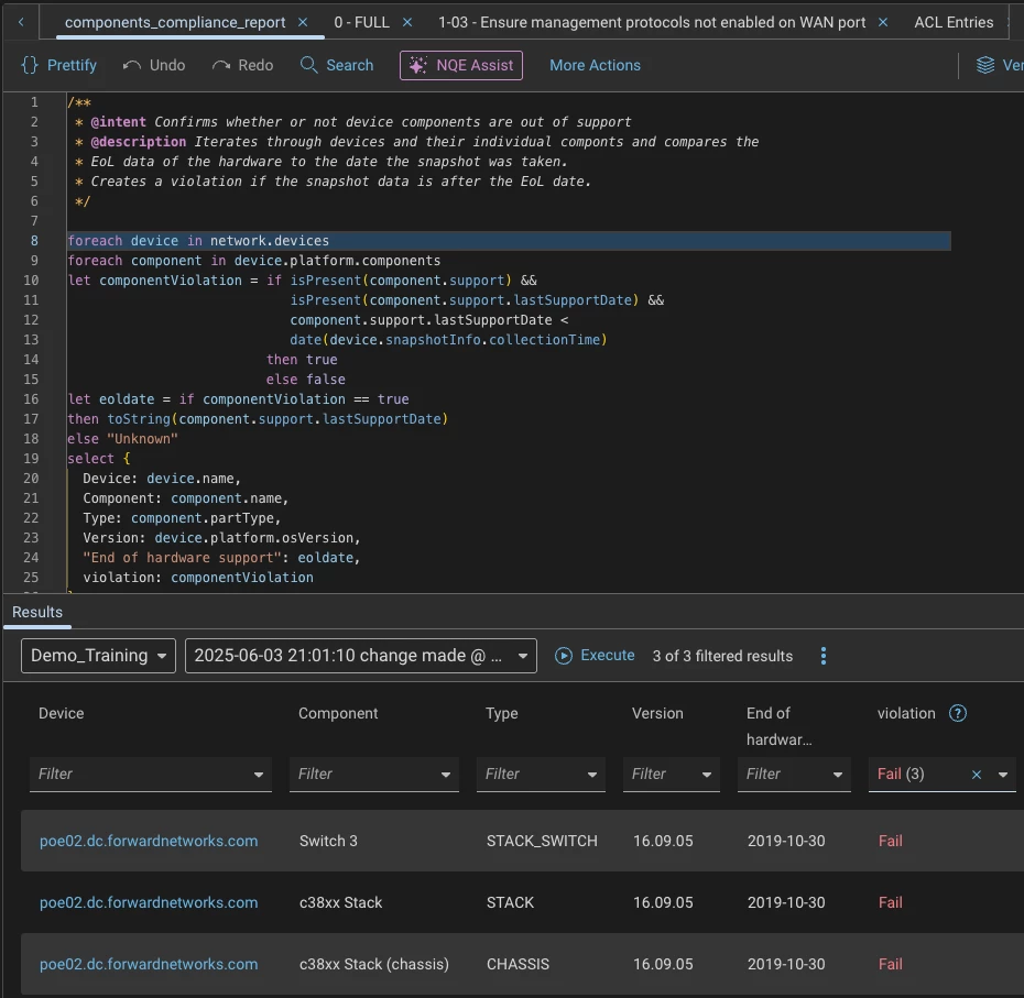 Using a simple NQE query, like the one I made below, you can quickly generate reports across your Cisco, F5, and Check Point environments for their EoL state. Add it as a verification check to get alerts when devices go EoL, or create a custom scorecard to monitor the current EoL status of your estate.