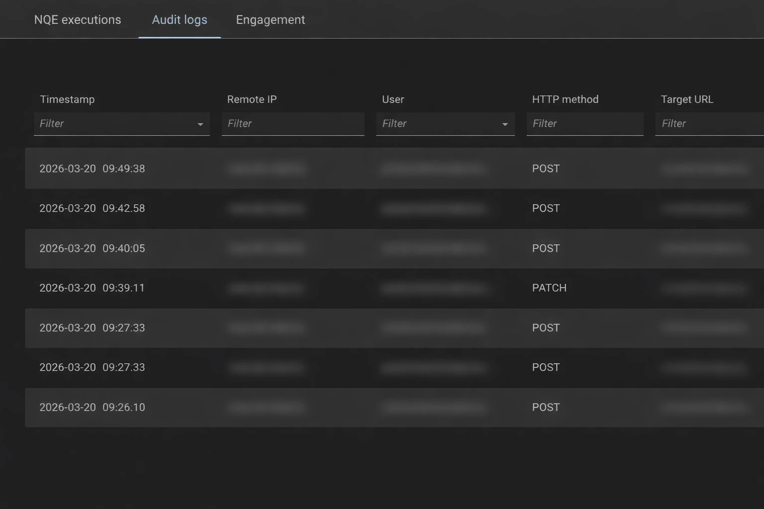 Audit Logs capture every meaningful change in your environment, including create, update, and delete operations, as well as authentication events. Every log entry includes the timestamp, originating IP address, the user who performed the action, the HTTP method used, the target object affected, and the outcome, giving you a complete, reliable picture of what happened and when.