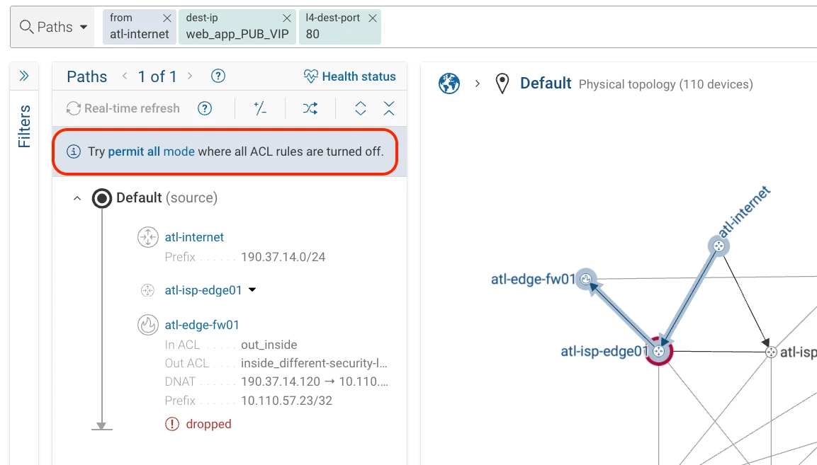 We can see immediately that the traffic is being blocked on an edge firewall (atl-edge-fw01). However, we don’t know what would happen to the traffic if it is permitted through this firewall and continues along its path.