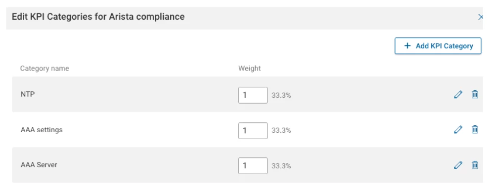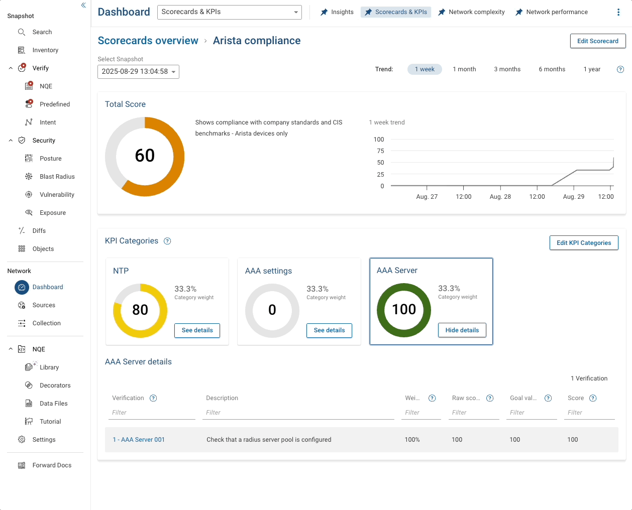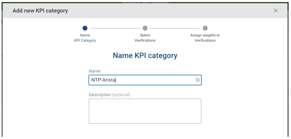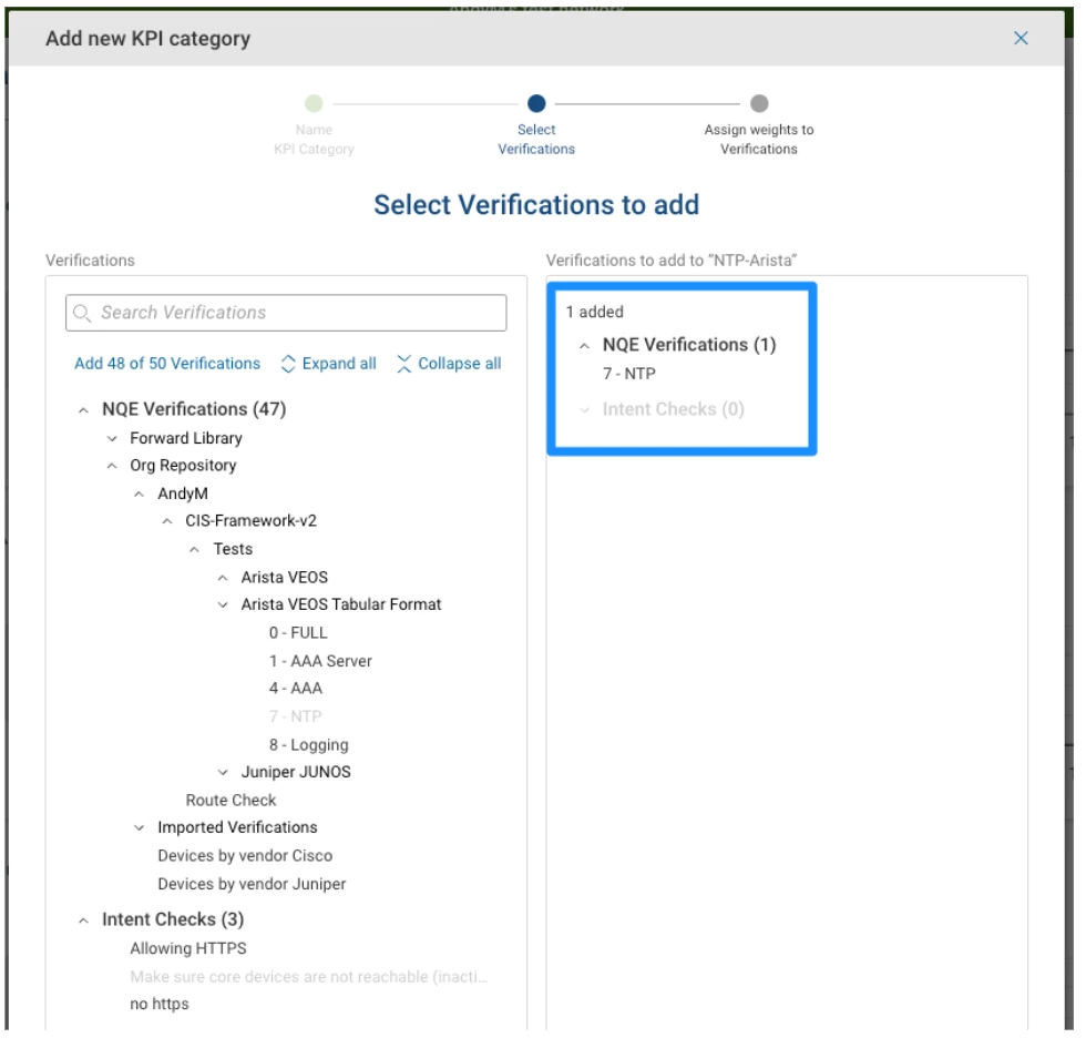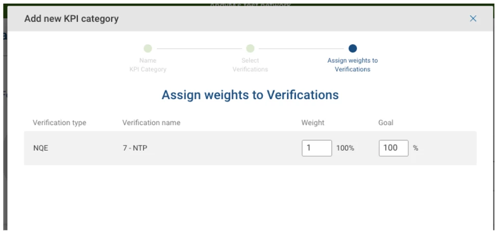 You can actually add more than one verification to a KPI, although in this example I’m not doing that. For example, you might have two NQE Verifications that are NTP-related - one for the server IP address and one for the source address - these might be grouped together in the same KPI and given different weights.