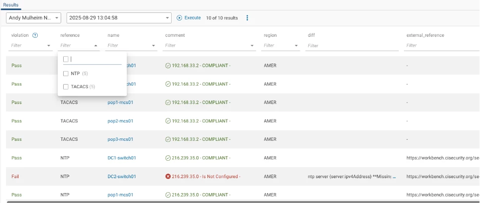 Running this now, we can see a full report for Arista EOS devices - you can filter by test name or region etc.