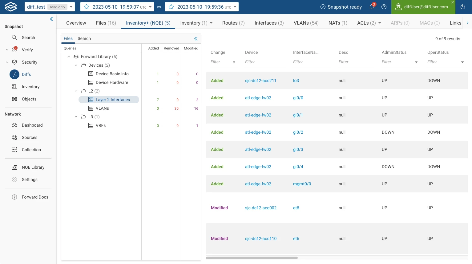 As part of this new experience, the release 23.5 introduces an additional component: the ability to run diffs for all NQE queries that are part of Inventory+. The system infers the presence of changes by analysing the NQE query table results, and it's capable of distinguishing between row addition, deletion and modification automatically without user intervention.