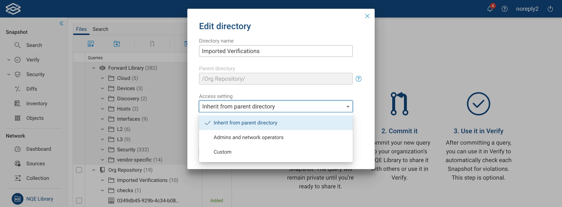 Release 23.3 introduces the ability to restrict write access to the NQE library queries. Our users have expressed the desire to protect the queries they and their teams have been working on from accidental or intentional editing by other users. By default, users with an Admin or network operator role have full write access to NQE queries. With this release, our users can define permissions on folders within the NQE Library to control who can edit individual queries and the contents of query folders themselves.