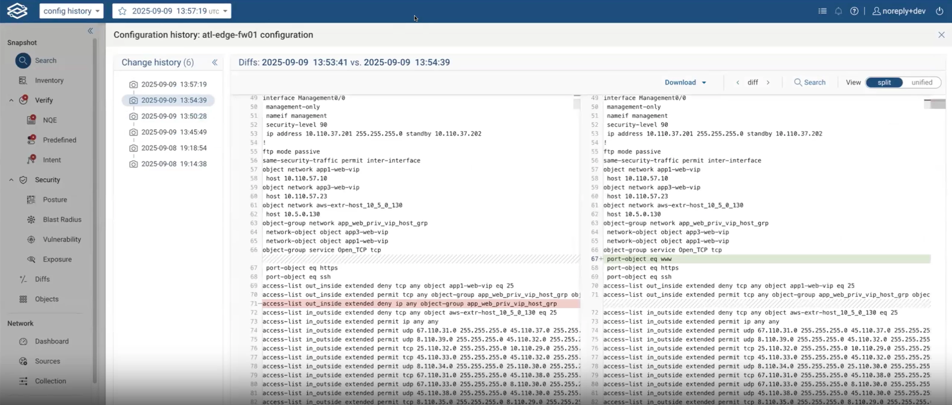 Device Config File History introduces a fast way to trace how a device’s configuration has changed over time, without needing to open prior snapshots. From any device configuration view, users can quickly surface which snapshots introduced changes, making it easier to understand when vulnerabilities or issues were introduced and to speed up root cause analysis. See the Device Config File History documentation for more details.