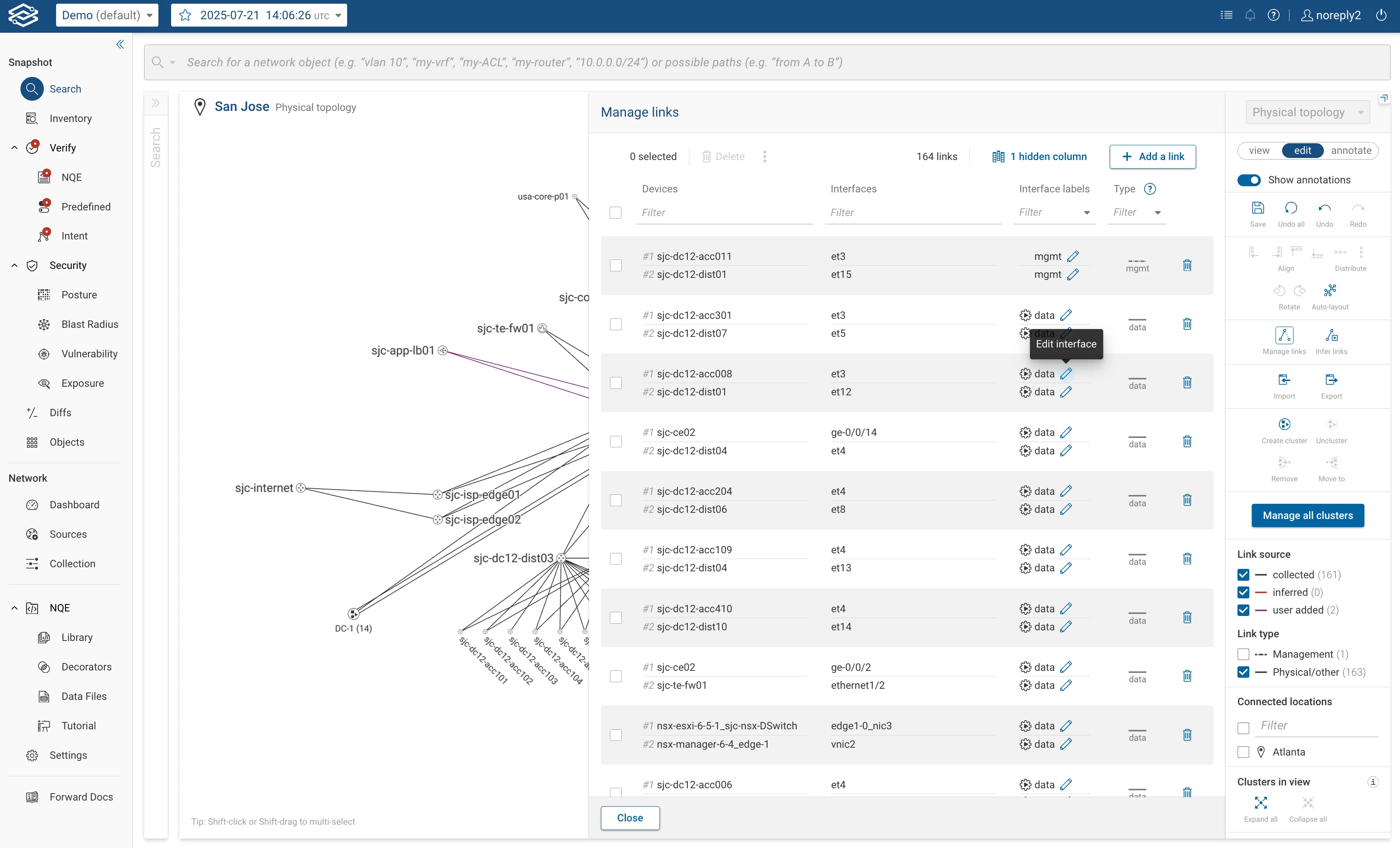 - Manual interface label overrides allow users to reclassify links as data or management, making it easier to declutter the topology view or focus specifically on management traffic. See the Manual Interface Label Override documentation for more details.