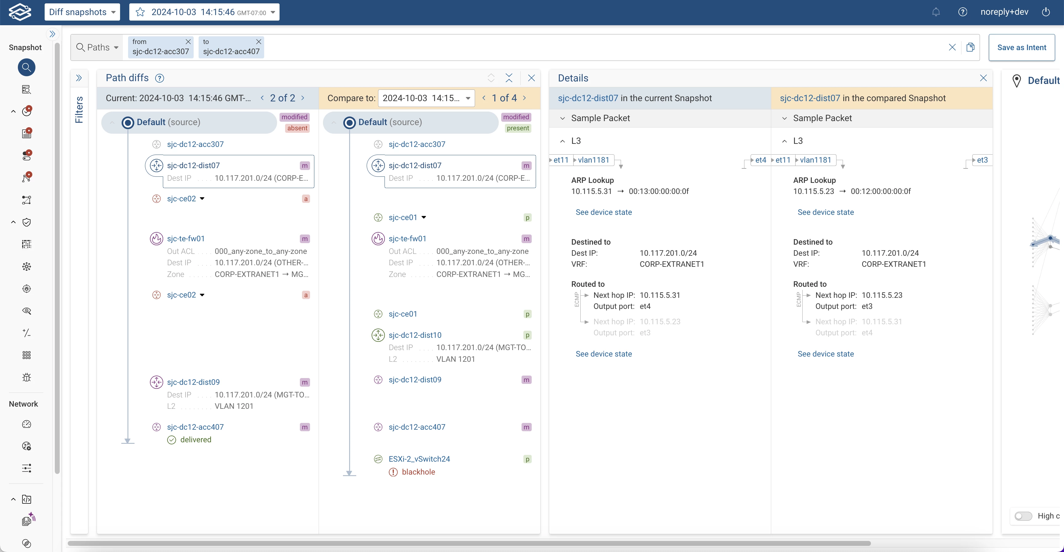 With Path Analysis Diffs, users can compare path search results across different snapshots to see how specific paths have evolved. This historical view allows operators to troubleshoot network changes by viewing configuration, device presence, and status differences between two snapshots.