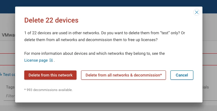In previous releases, device license decommissioning was a multi-step process, with the 24.3 update, this process has been streamlined to allow for the removal and decommissioning of multiple devices across multiple networks in a single action. Decommissioning devices have also been grouped and can be viewed in a single location within the license dashboard.
