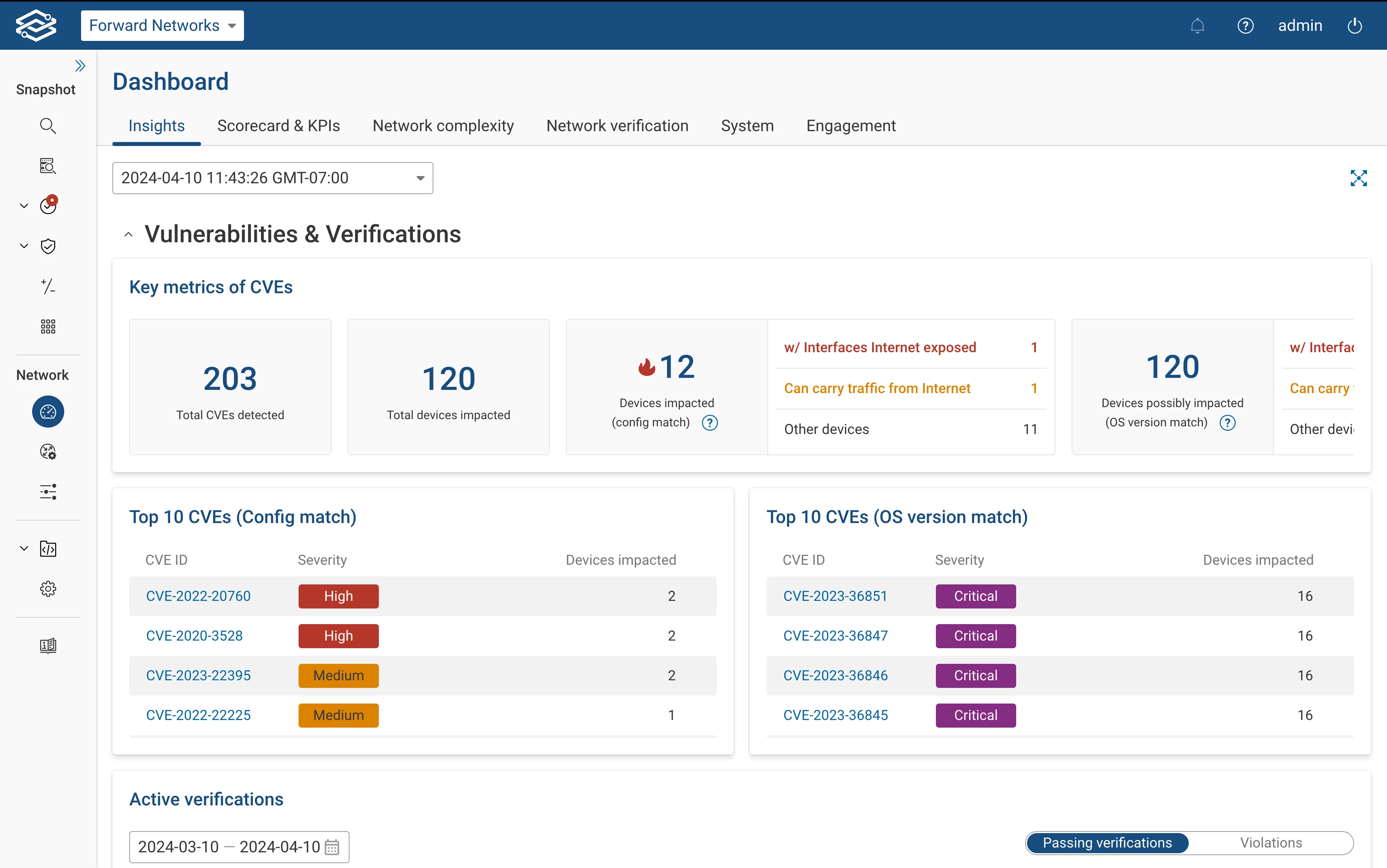 - Vulnerabilities and Verifications: Provides key CVE metrics, a list of the top 10 CVEs (by configuration and OS version), and total active verifications.