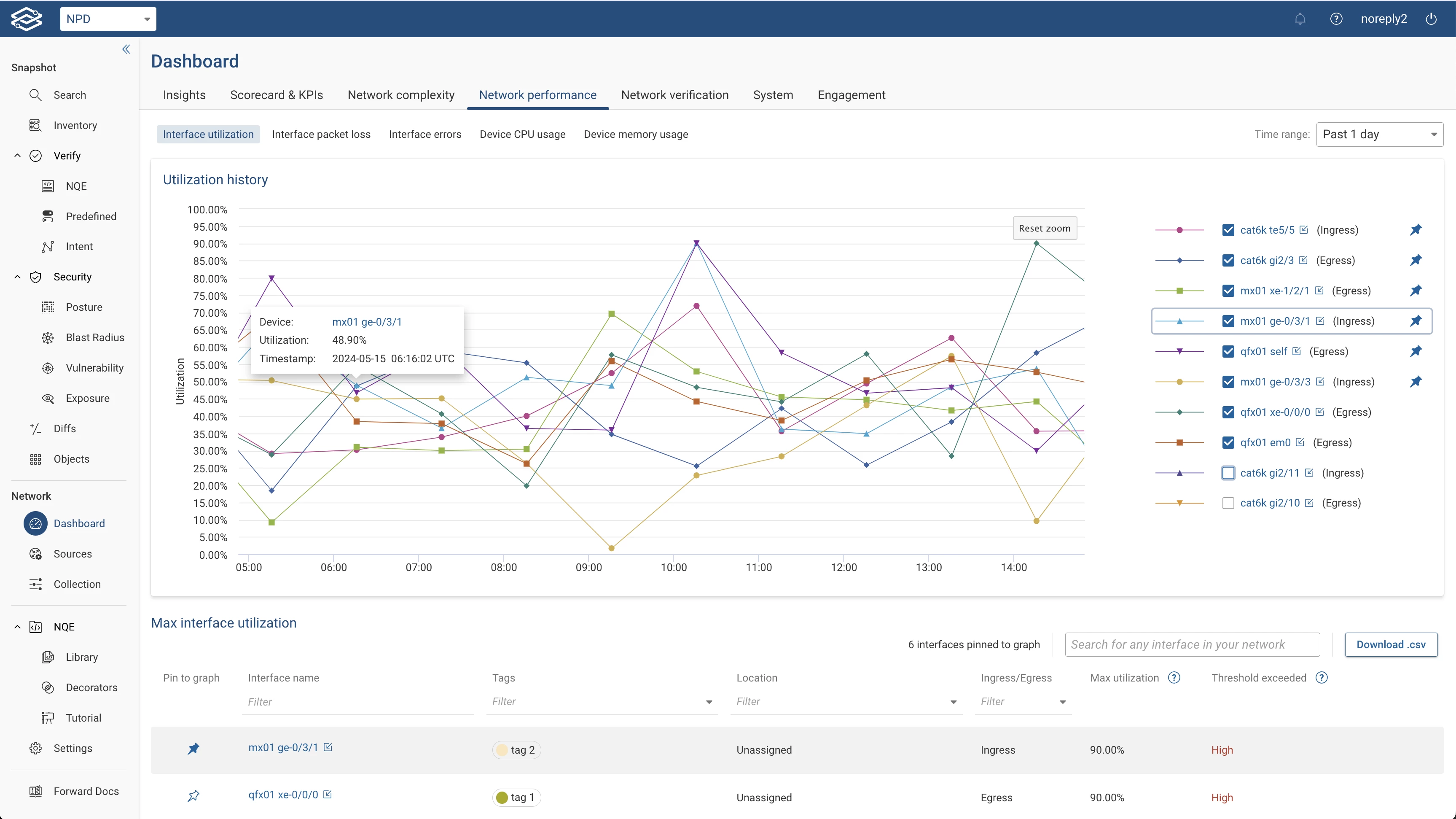 The new Network Performance Dashboard provides a detailed and interactive view of network performance metrics collected via SNMP. This dashboard enhances the digital twin of the network by integrating performance data with existing configuration and state information.