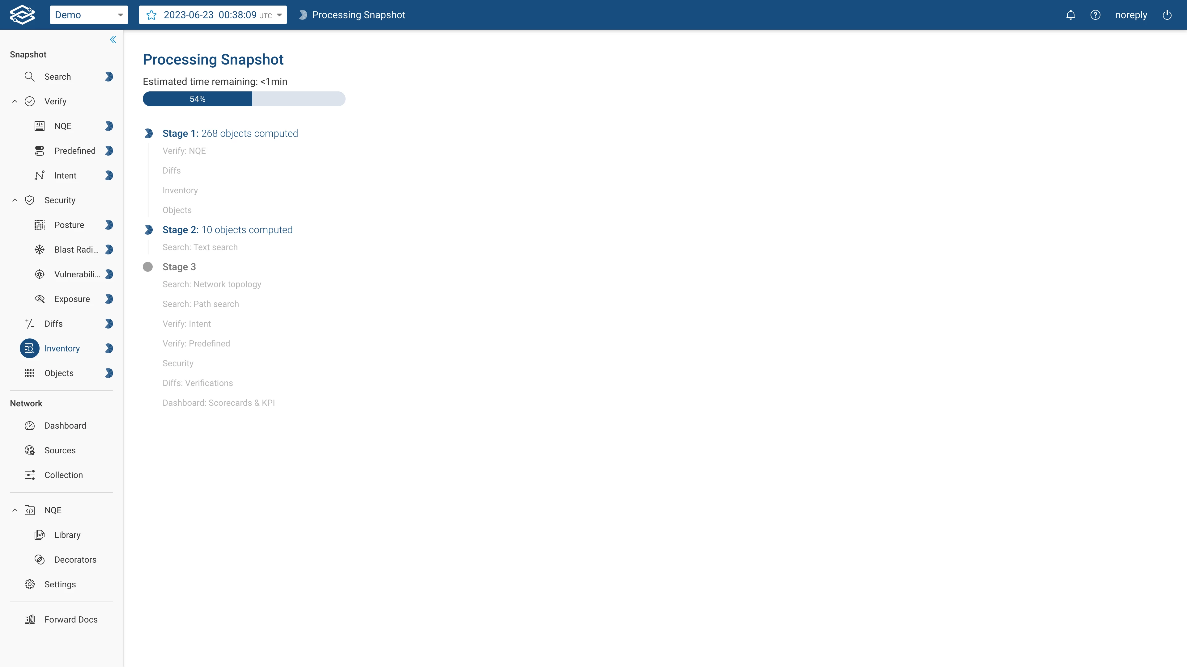 Some Forward Enterprise applications donāt need a snapshot to be fully processed before they can be used. This enhancement allows our users to start leveraging Forward EnterpriseĀ applications as they become available, drastically increasing the efficiency around accessing more recent network data. This is especially true in large deployments, with tens of thousand of devices. Access to the NQE Library, for example, can be available much earlier as the snapshot continues to process. This functionality is enabled by default with 23.9.