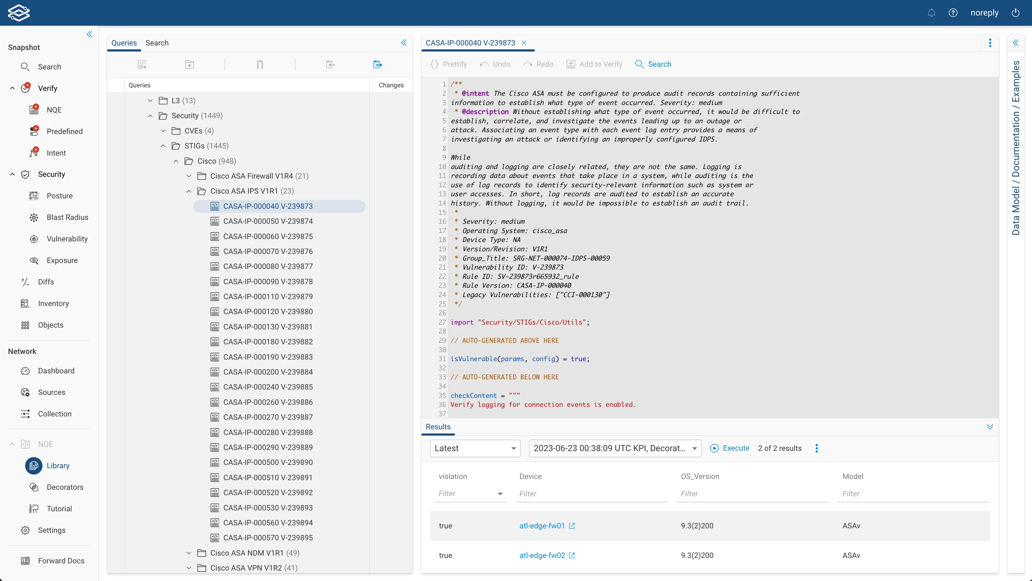 Building on this, the 24.1 release provides an addition of over 1,440 STIGs-based NQE queries in the NQE Library, providing full coverage of Cisco and Juniper STIGs rules. Users can now effortlessly validate network compliance and verify adherence to any supported STIG rule across their entire device fleet with just a click.