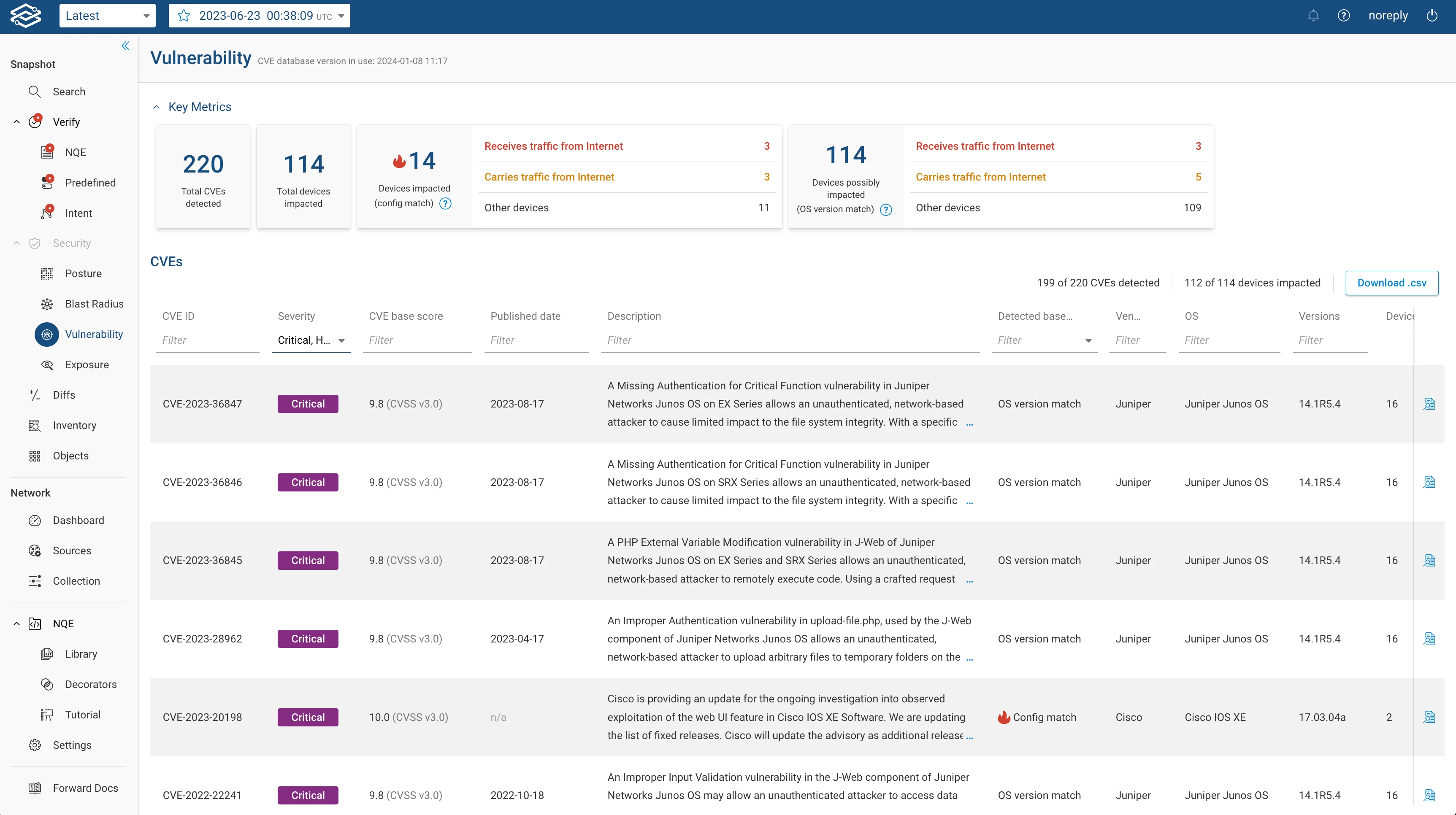 Vulnerability Management is a cornerstone of network infrastructure security, playing a vital role in safeguarding against potential threats. Chief Information Security Officers (CISOs) recognize the critical importance of regularly assessing and addressing vulnerabilities in network devices. Identifying and remedying these vulnerabilities is essential to prevent potential exploits that could compromise the confidentiality, integrity, and availability of your network. Forward Enterprise offers a proactive Vulnerability Management functionality, empowering users to proactively address emerging threats, thereby reducing the risk of data breaches and service disruptions.