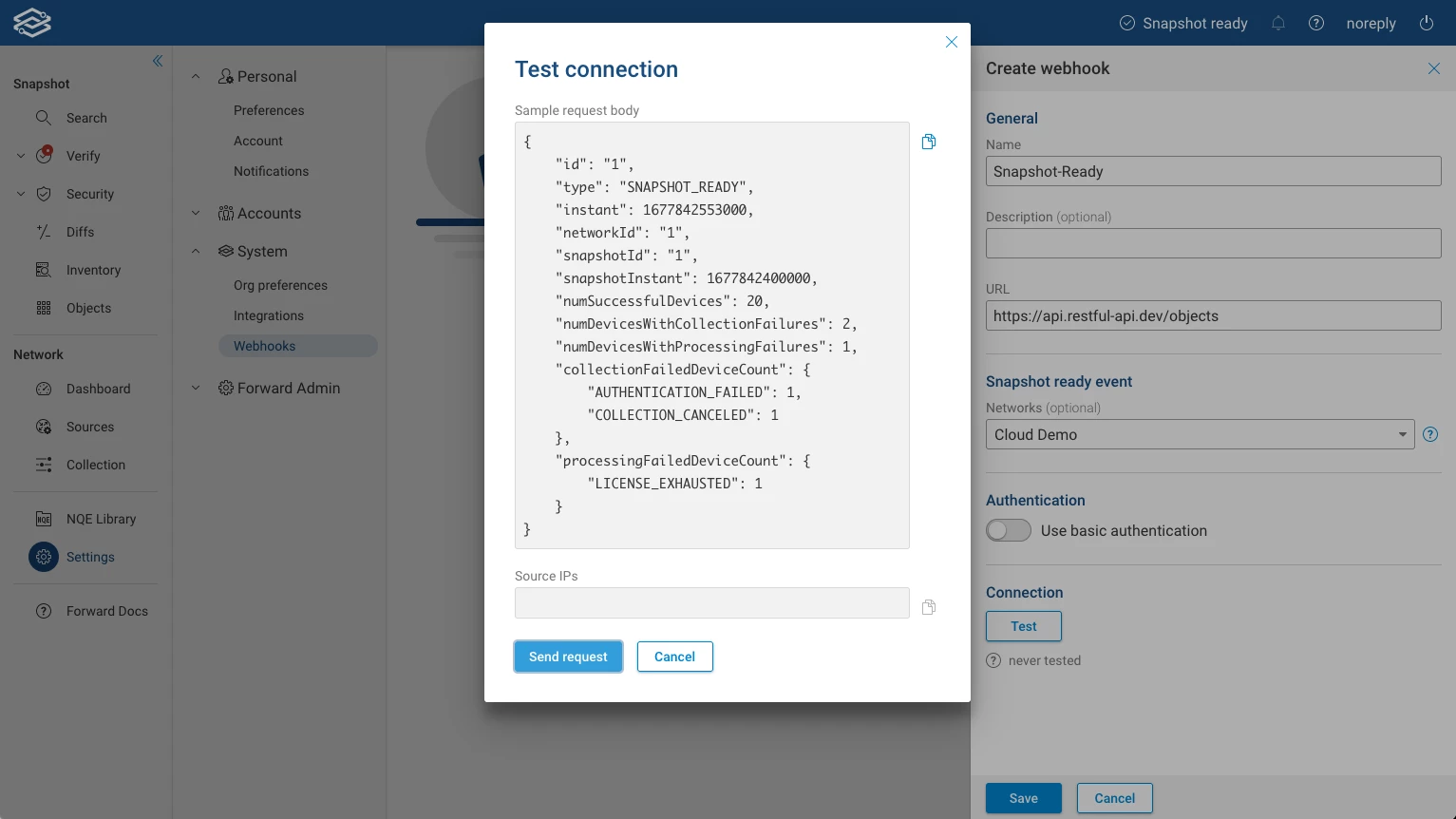 This release introduces the first webhook for the Forward platform. Our users can now subscribe their external applications to receive an event anytime a snapshot has been processed successfully, and it's ready to be used. This is the first of a series of webhooks that will be made available in the following releases.