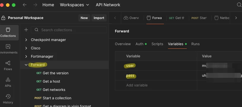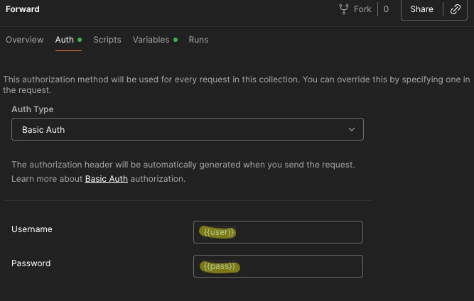 Now you’ve done the above steps, any API calls you write in the Forward folder will inherit the username and password from the parent folder. If you change the username or password it only needs to be changed in that one place for all scripts to get the new values.