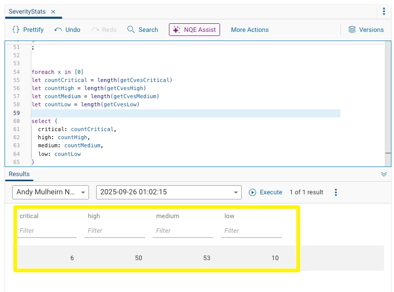 We are going to use an NQE script to tally the number of vulnerabilities there are of each severity on the network.