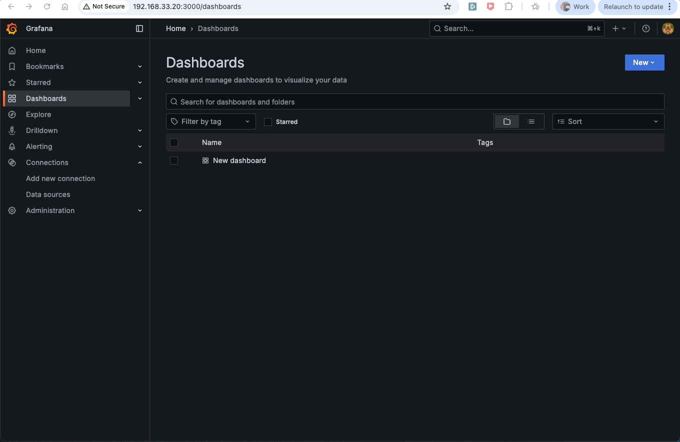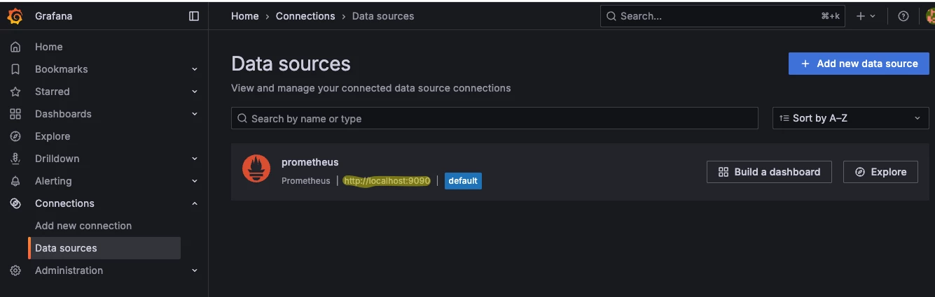 Log in and add a new Data Source under Connections. Prometheus can be queried on port 9090 for metrics about itself - this is a good way to test if Grafana and Prometheus can talk: