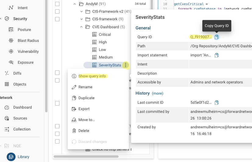 Your Query ID can be found by clicking the three dots next to the query, opening Query Info and copying the Query ID. If you forgot to commit your query, this ID will not be present: