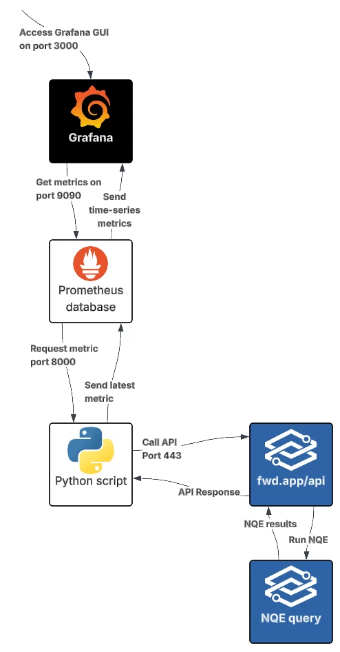 Prometheus can pull metrics from systems that present data in a Prometheus format, but it cannot pull metrics from a REST API. For this, we need a Python script to query the Forward API and convert the data retrieved into Prometheus telemetry.