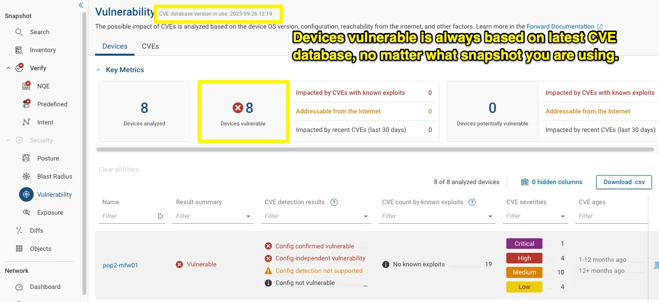At the time of writing (release 25.9) Forward Enterprise’s CVE count is based on the current CVE database. If you pull up a snapshot from a month ago, the snapshot is compared with today’s CVE database. So going back to the vulnerability pages on old snapshots will not allow you to see how many CVEs you’ve squashed as a result of all those late-night maintenance windows.