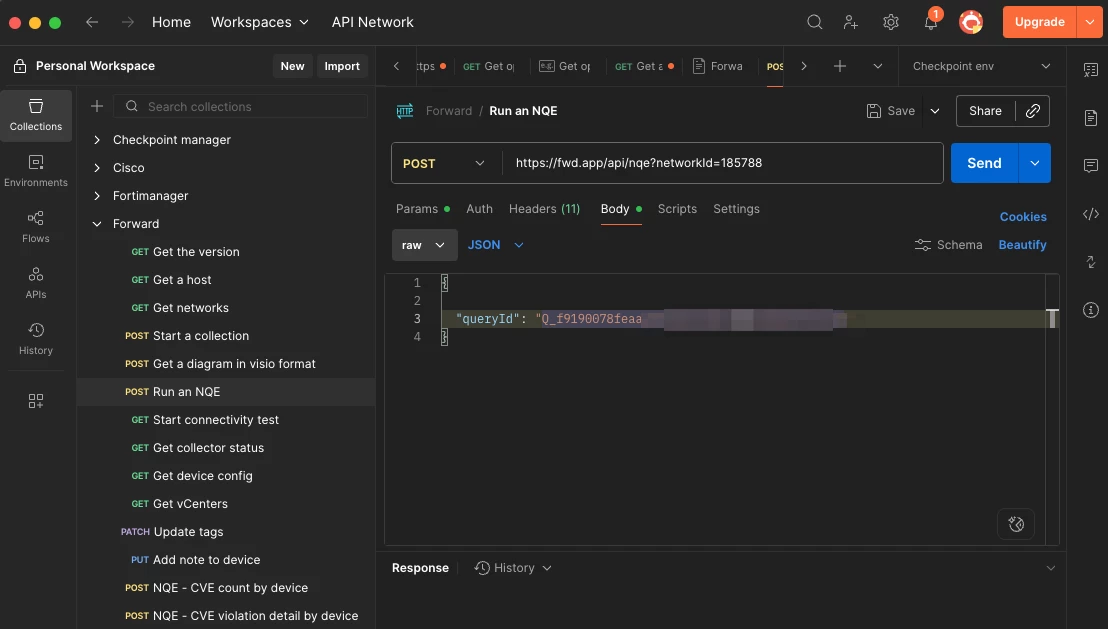 We are ready to make a test API call. Add a POST request to the Forward folder using https://fwd.app/api/nqe?networkId=<YOURNETWORKID>