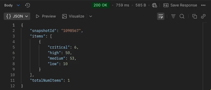 message with a JSON response. The values for critical, high, medium and low are exactly the same as what we saw in the GUI earlier - as you might expect: